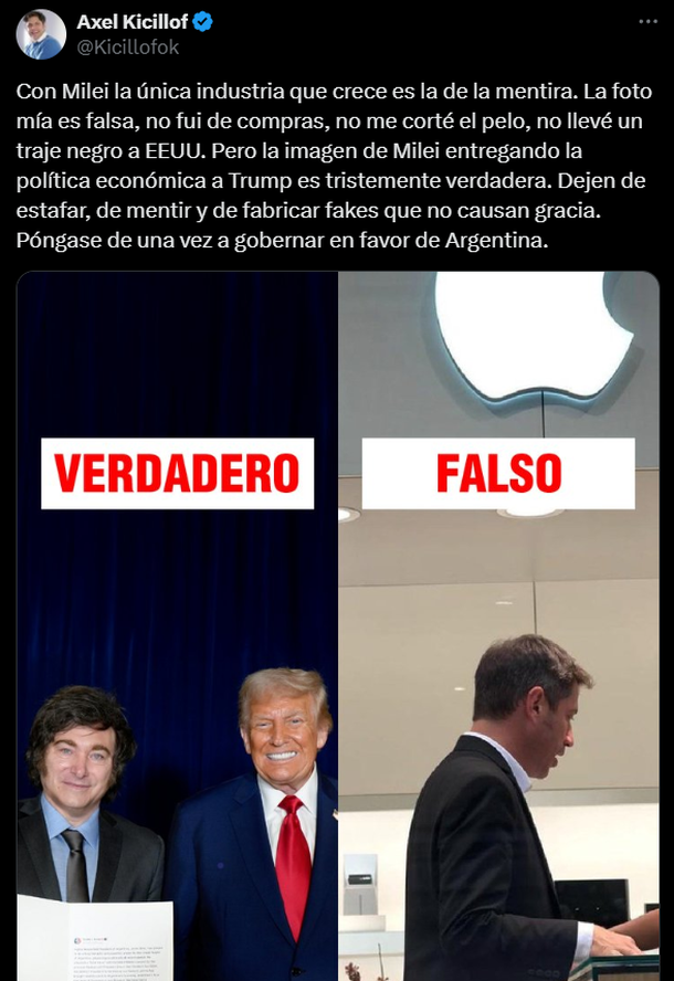 “Con Milei la única industria que crece es la de la mentira. La foto mía es falsa, no fui de compras, no me corté el pelo, no llevé un traje negro a EEUU. Pero la imagen de Milei entregando la política económica a Trump es tristemente verdadera. Dejen de estafar, de mentir y de fabricar fakes que no causan gracia. Póngase de una vez a gobernar en favor de Argentina”, escribió el mandatario provincial en un extenso descargo.