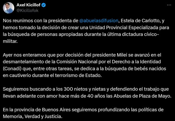 El gobernador se reunió con la presidenta de Abuelas de Mayo, Estela de Carlotto, y le propuso crear la nueva área. “Seguiremos buscando a los 300 nietos y nietas y defendiendo el trabajo que llevan adelante con amor hace más de 40 años las Abuelas de Plaza de Mayo”, escribió en sus redes sociales.“En la provincia de Buenos Aires seguiremos profundizando las políticas de Memoria, Verdad y Justicia”, detalló Kicillof.