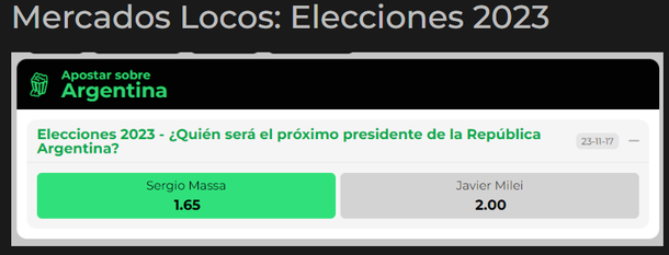 Por su parte, Milei paga una cuota de 2,00. Esto significa que si un jugador decide apostarle también $10.000 recibirá exactamente el doble, $20.000, si el libertario es elegido como el próximo jefe de Estado.