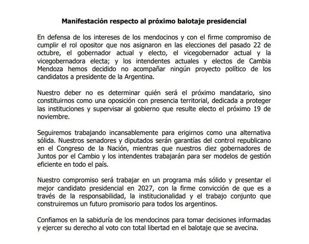 “En defensa de los intereses de los mendocinos y con el firme compromiso de cumplir el rol opositor que nos asignaron en las elecciones del pasado 22 de octubre, el gobernador actual y electo, el vicegobernador actual y la vicegobernadora electa; y los intendentes actuales y electos de Cambia Mendoza hemos decidido no acompañar ningún proyecto político de los candidatos a presidente de la Argentina”, expresaron esta mañana en un comunicado.