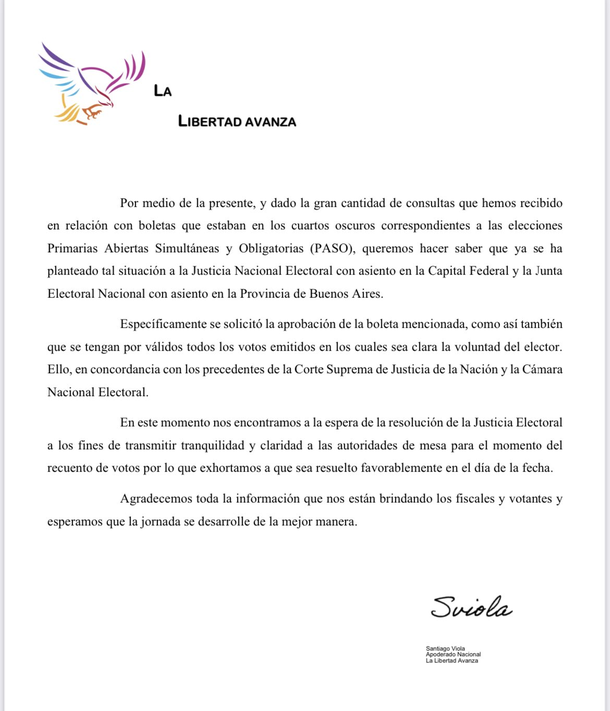 La Libertad Avanza lanzó un comunicado para que se acepten Boletas de las PASO
