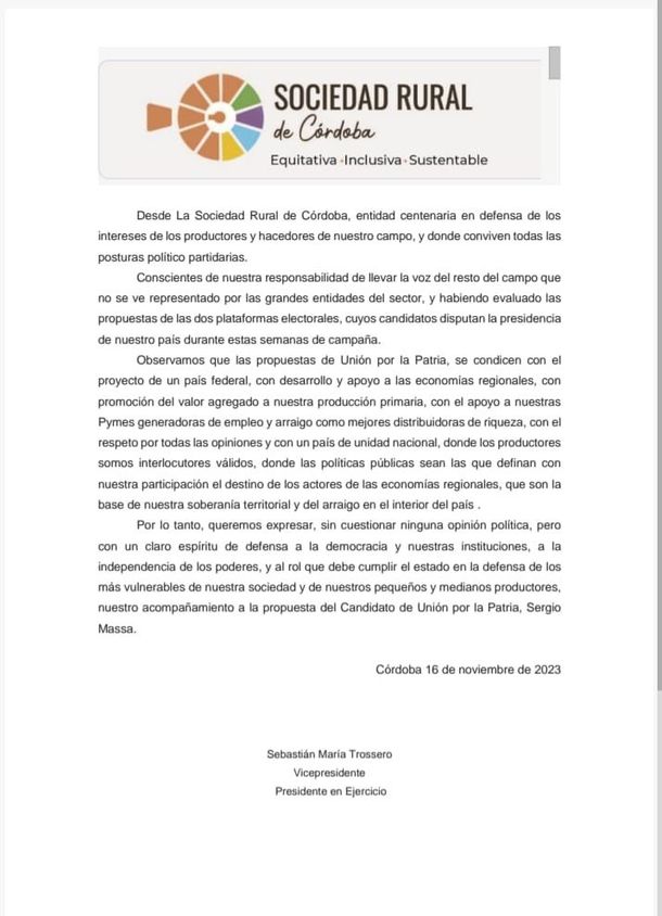 En un claro y extenso comunicado a favor de Sergio Massa, la Sociedad Rural de Córdoba manifestó su postura de cara al balotaje: "Queremos expresar, sin cuestionar ninguna opinión política, pero con un claro espíritu de defensa a la democracia y nuestras instituciones, a la independencia de los poderes, y al rol que debe cumplir el Estado en la defensa de los más vulnerables de nuestra sociedad y de nuestros pequeños y medianos productores, nuestro acompañamiento a la propuesta del candidato de Unión por la Patria, Sergio Massa".