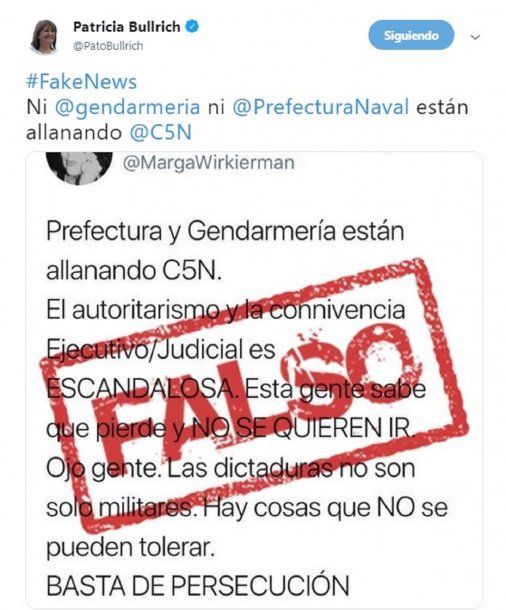 Pero pese a los videos que circularon en las redes y a lo registrado por las cámaras del canal, la ministra de Seguridad de la Nación, Patricia Bullrich afirmó desde su cuenta de Twitter: "#FakeNews Ni @gendarmeria ni @PrefecturaNaval están allanando @C5N". Los dichos de la creadora del Servicio Cívico Voluntario no calaron entre los internautas de esa red social que mantuvieron el hash entre lo más mencionado.