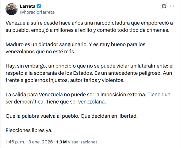 Horacio Rodríguez Larreta: En un comunicado en su cuenta de X escribió: "Venezuela sufre desde hace años una narcodictadura que empobreció a su pueblo, empujó a millones al exilio y cometió todo tipo de crímenes. Maduro es un dictador sanguinario. Y es muy bueno para los venezolanos que no esté más. Hay, sin embargo, un principio que no se puede violar unilateralmente: el respeto a la soberanía de los Estados. Es un antecedente peligroso. Aun frente a gobiernos injustos, autoritarios y violentos. La salida para Venezuela no puede ser la imposición externa. Tiene que ser democrática. Tiene que ser venezolana. Que la palabra vuelva al pueblo. Que decidan en libertad. Elecciones libres ya".