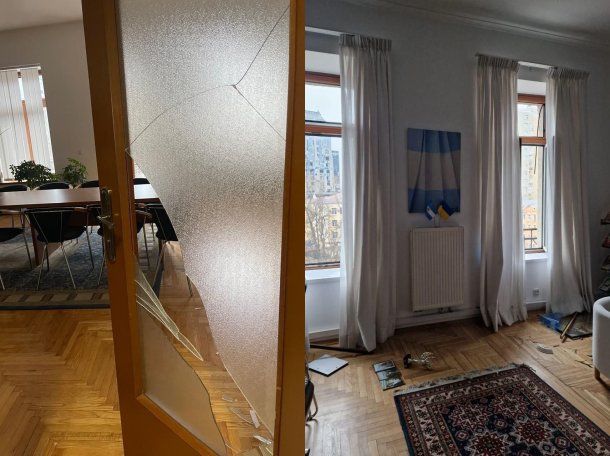 Tal como se puede observar en las en las fotos que difundió el Ministerio de Asuntos Exteriores de Ucrania, el impacto de los misiles y la onda expansiva provocó rotura de vidrios de las ventanas, caída de mampostería de los techos y el destrozo de algunos objetos dentro de las oficinas en las que trabaja el personal diplomático.
