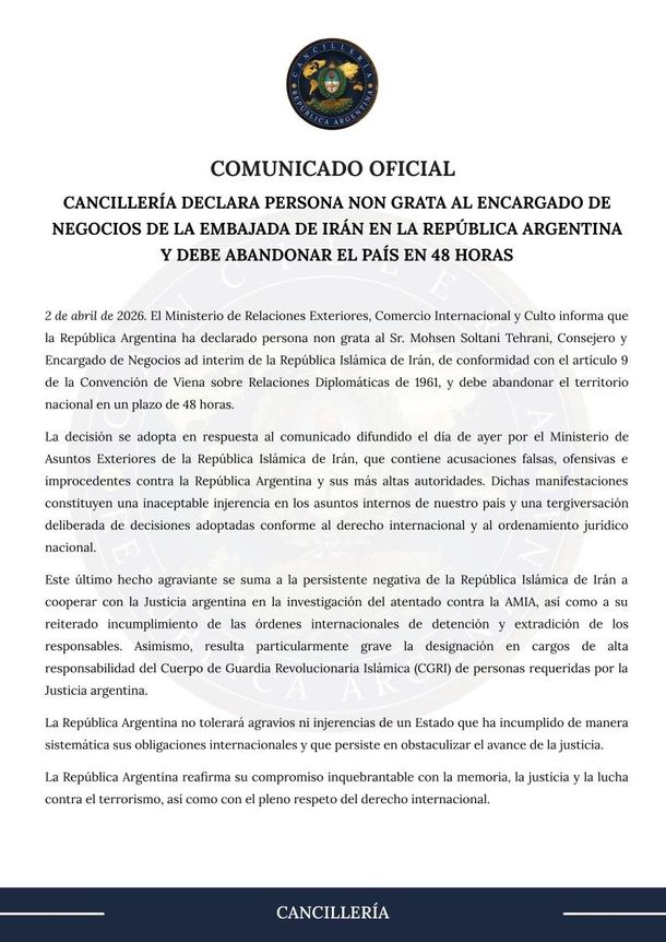La Cancillería declaró este jueves "persona non grata" al encargado de negocios de Irán, Mohsen Soltani Tehrani, y le exigió abandonar el país en un plazo de 48 horas.