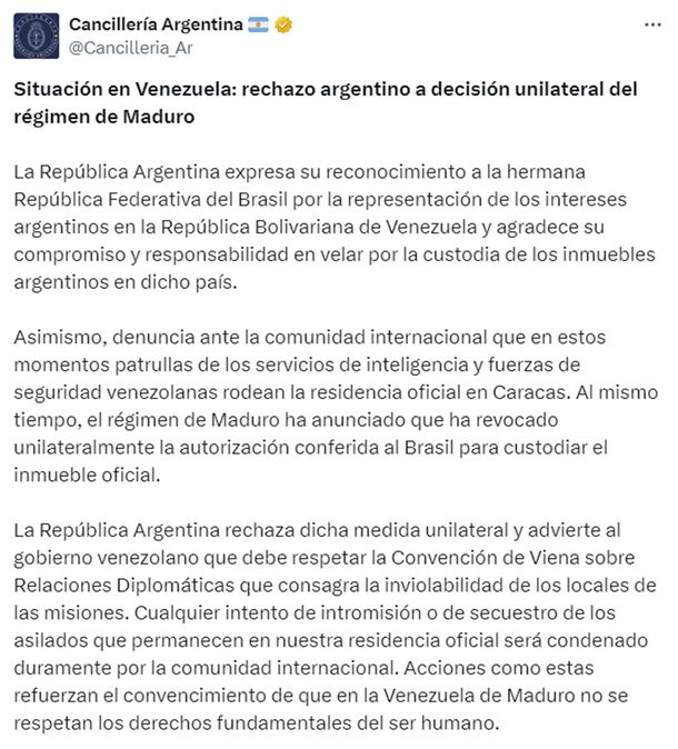 "La República Argentina rechaza dicha medida unilateral y advierte al gobierno venezolano que debe respetar la Convención de Viena sobre Relaciones Diplomáticas que consagra la inviolabilidad de los locales de las misiones", comienza el comunicado oficial.