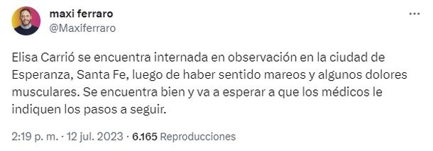 Carrió se encuentra internada en observación, según confirmó a través de su cuenta de Twitter, el presidente de la Coalición Cívica ARI y actual Diputado Nacional por la Ciudad de Buenos Aires Maximiliano Ferraro.