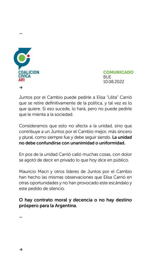 “Juntos por el Cambio puede pedirle a Elisa “Lilita” Carrió que se retire definitivamente de la política, y tal vez es lo que quiere. Si eso sucede, lo hará, pero no puede pedirle que le mienta a la sociedad”, comienza el comunicado que lleva el sello de la Coalición Cívica ARI.