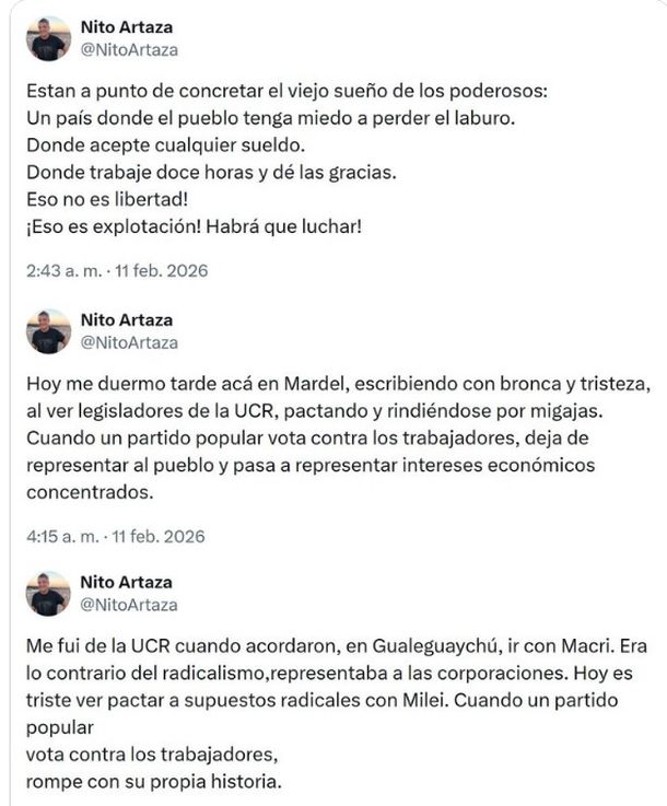 En otros posteos, Artaza expresó su indignación hacia sectores de la UCR, a los que acusó de “pactar y rendirse por migajas” y de abandonar los principios que históricamente caracterizaron al radicalismo. “Hoy me duermo tarde acá en Mar del Plata, escribiendo con bronca y tristeza, al ver legisladores de la UCR, pactando y rindiéndose por migajas. Cuando un partido popular vota contra los trabajadores, deja de representar al pueblo y pasa a representar intereses económicos concentrados”, señaló, en referencia a los acuerdos políticos que habrían permitido avances del proyecto de reforma laboral.