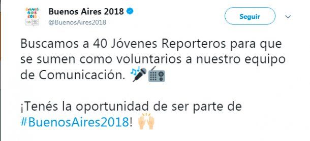 Es que en las redes sociales estallaron las críticas contra una convocatoria de la Ciudad en el que ofrecen realizar una experiencia no rentada para cubrir los Juegos Olímpicos de la Juventud que se desarrollarán en octubre del 2018.
