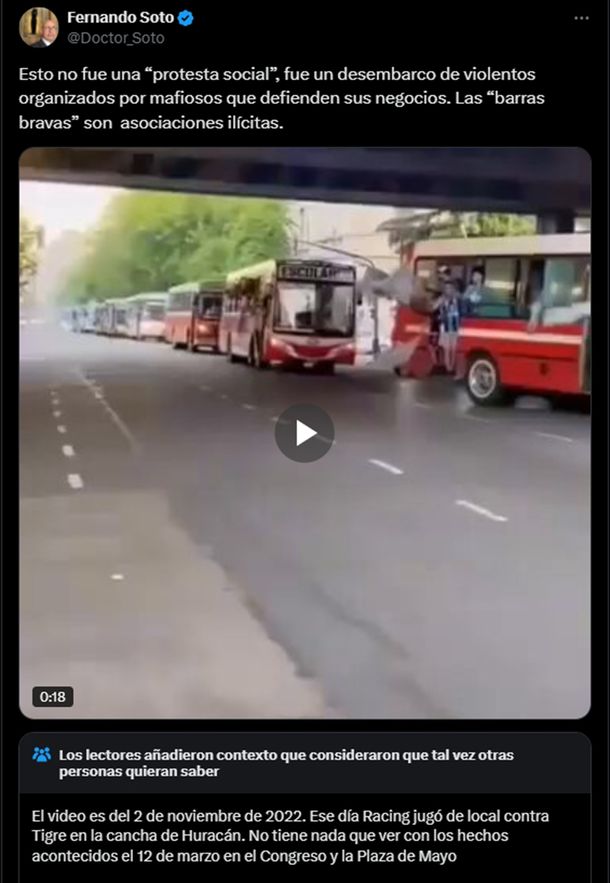 "Esto no fue una ‘protesta social’, fue un desembarco de violentos organizados por mafiosos que defienden sus negocios. Las ‘barras bravas’ son asociaciones ilícitas", expresó, junto a las imágenes de micros con hinchas y banderas, que en realidad correspondía a noviembre de 2022.