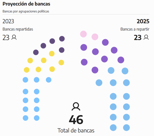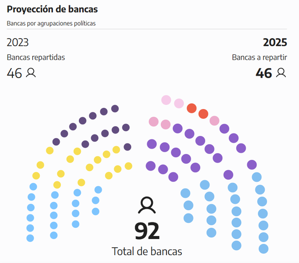 Teniendo en cuenta los senadores que no fueron renovados, Fuerza Patria tendrá un total de 24 diputados, La Liberad Avanza 13, Juntos por el Cambio 7 y Somos Buenos Aires dos.