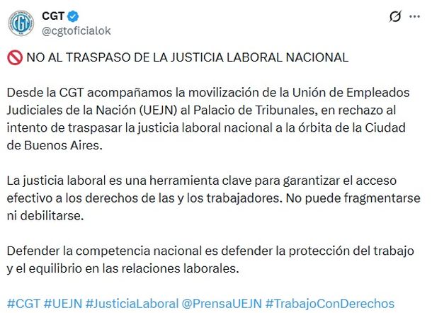La Confederación General del Trabajo (CGT) rechazó el traspaso de la Justicia Laboral Nació a la ciudad de Buenos Aires. “Acompañamos la movilización de la Unión de Empleados Judiciales de la Nación (UEJN) al Palacio de Tribunales”, expresaron en un comunicado.