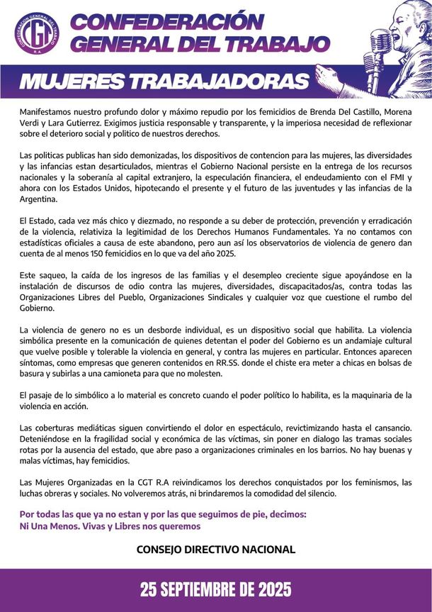 La Confederación General del Trabajo (CGT) emitió un comunicado a través de su área de Mujeres Trabajadoras, donde manifestó su “profundo dolor y máximo repudio” por los crímenes de Brenda Del Castillo, Morena Verdi y Lara Gutiérrez, asesinadas en la localidad bonaerense de Florencio Varela.