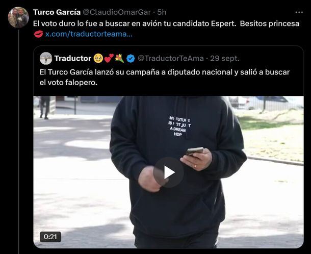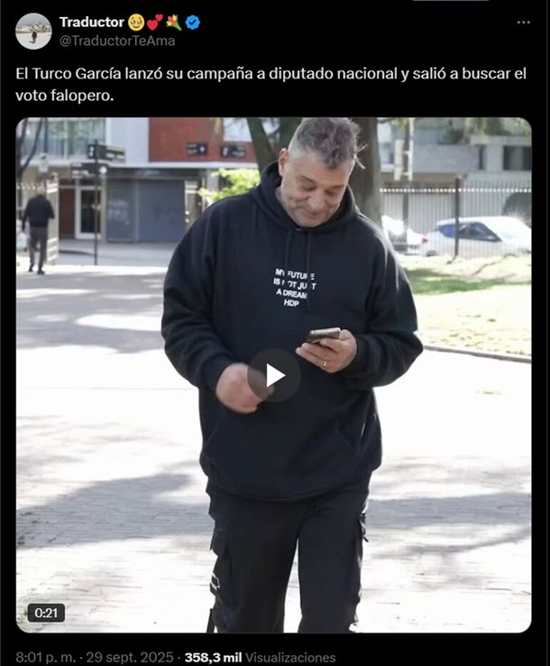 Todo comenzó cuando Esteban Glavinich, más conocido en X como "Traductor Te Ama", citó un video de campaña del exfutbolista y actual candidato a diputado nacional por la Ciudad de Buenos Aires, y manifestó: "El Turco García lanzó su campaña a diputado nacional y salió a buscar el voto falopero".