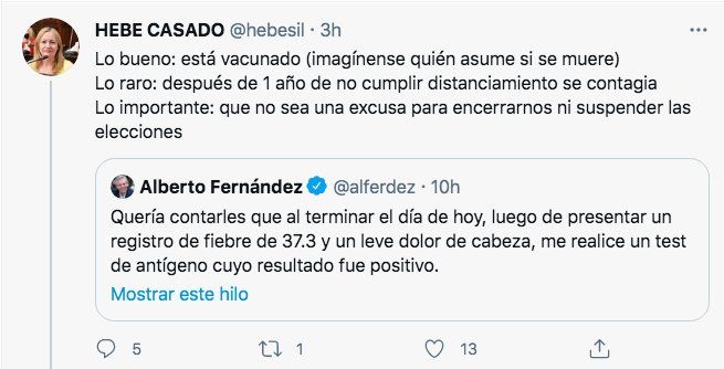 Pero de no solidarizarse en forma rápida a desear el mal hay un paso que podría ser largo pero que al final fue corto: la diputada provincial por Mendoza Hebe Casado en la red social Twitter con el símbolo de rezar pidió que la vicepresidenta Cristina Kirchner haya sido contacto estrecho de Alberto Fernández.