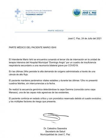 Parte médico del intendente de José C. Paz, Mario Ishii