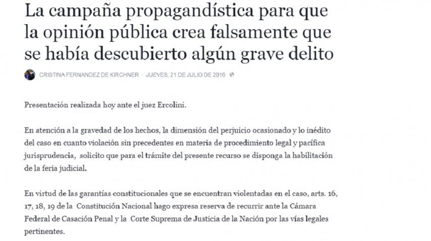 La ex mandataria compartió el escrito que presentó ante el juez Julián Ercolini, en el cual solicitó la apertura de la feria judicial para tratar "el embargo de las cajas de seguridad y los depósitos en pesos y en moneda extranjera bancarizados". Además pidió por la liberación de la lider de la Tupac Amaru.