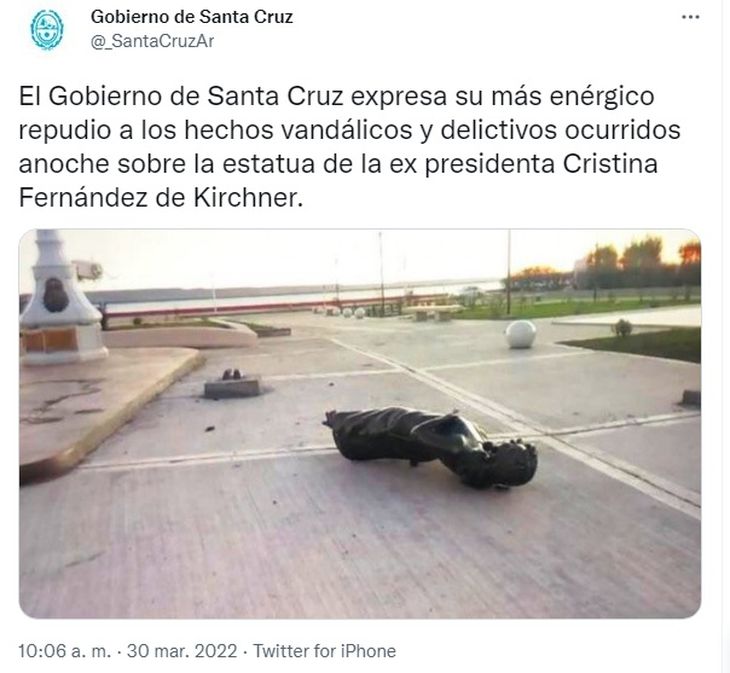 En tanto, el Gobierno de Santa Cruz expresó "su más enérgico repudio a los hechos vandálicos y delictivos ocurridos anoche sobre la estatua de la ex presidenta Cristina Fernández de Kirchner", a través de un mensaje publicado en la cuenta oficial de la red social Twitter del Ejecutivo de esa provincia patagónica.