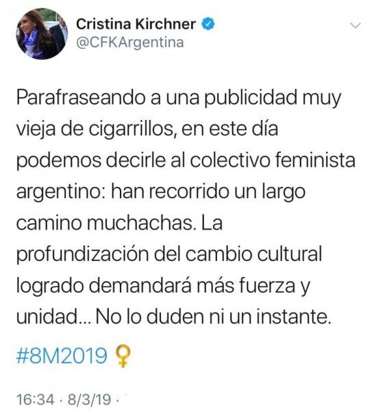 La ex presidenta Cristina Kirchner saludó en Twitter por el Día Internacional de la Mujer. La senadora aseguró que “la profundización del cambio cultural logrado demandará más fuerza y unidad”.
