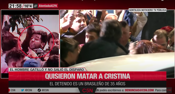 Según se observaron en las imágenes difundidas por C5N, el atacante sacó un arma y gatilló en la cara de la ex mandataria.