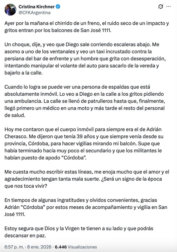 En la misma publicación, la expresidenta reveló la identidad de la víctima, a quien los militantes del barrio apodaban cariñosamente “Córdoba”. Según indicó, Cherasco viajaba frecuentemente desde su provincia natal, Córdoba, para participar de las vigilias frente al balcón de la dirigente.