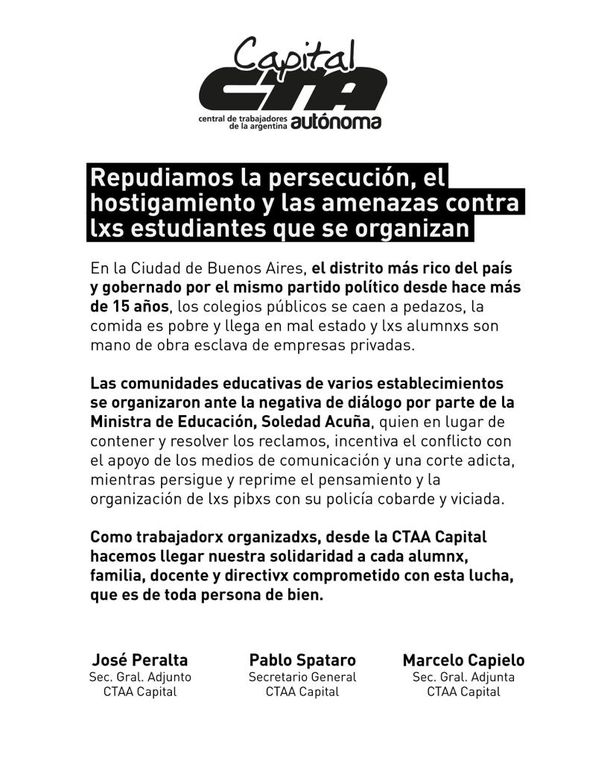 En un escrito publicado en mensaje inclusivo y firmado por José Peralta, Pablo Spataro y Marcelo Capielo, finalizaron: “Como trabajadores organizados, desde la CTAA Capital hacemos llegar nuestra solidaridad con cada alumno, familia, docente y directivo comprometido con esta lucha, que es de toda persona de bien”.