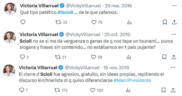En tanto, en el 2016, Villarruel manifestó: "Qué tipo patético Scioli... de la que zafamos".