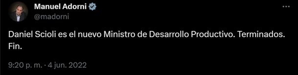 Otro de los que quedó en off side con la asunción del exembajador en el gabinete nacional, es nada más y nada menos, que el tuitero devenido en funcionario, Manuel Adorni, que el año pasado escribió: "Daniel Scioli es el nuevo Ministro de Desarrollo Productivo. Terminados. Fin".