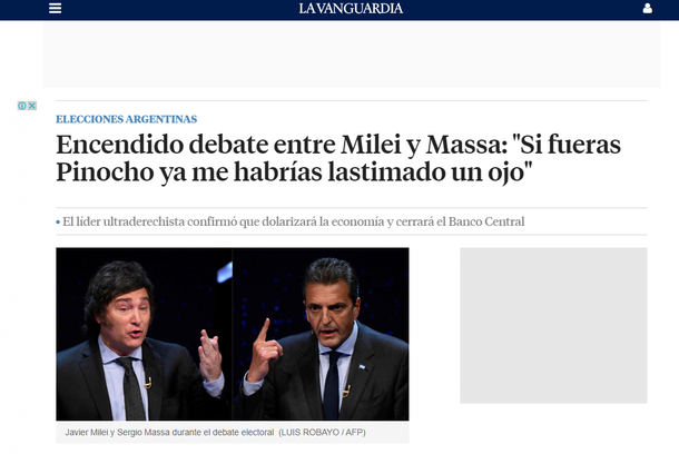 El diario La Vanguardia, de Barcelona, tituló por su parte: "Encendido debate entre Milei y Massa: 'Si fueras Pinocho ya me habrías lastimado un ojo'", en alusión a una frase pronunciada por el candidato libertario para referirse al postulante oficialista.