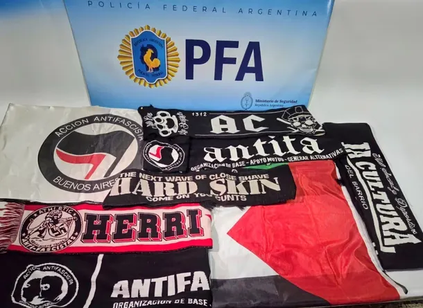 En el lugar se encontraron banderas con inscripciones antifascistas, otras pertenecientes al movimiento Antifa, doce pines con amenazas contra el presidente Javier Milei y banderas de Palestina.