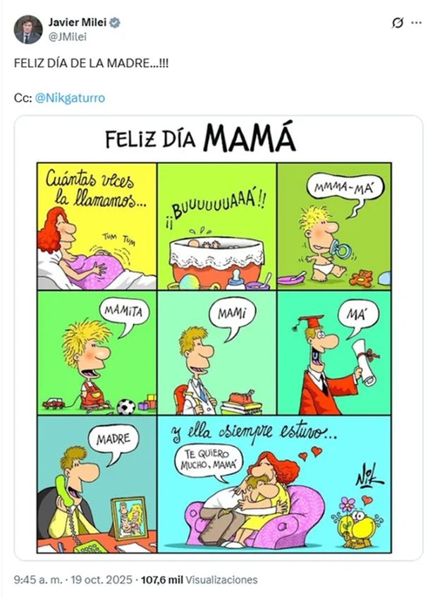 El presidente Javier Milei usó sus redes sociales para saludar a las madres en su día, y compartió una viñeta de Gaturro, del dibujante Nik, cercano a la administración libertaria.