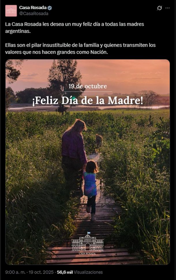 Javier Milei también compartió el posteo de la efemérides que realizó la cuenta oficial de la casa de gobierno en X: "La Casa Rosada les desea un muy feliz día a todas las madres argentinas. Ellas son el pilar insustituible de la familia y quienes transmiten los valores que nos hacen grandes como Nación", señala el posteo.