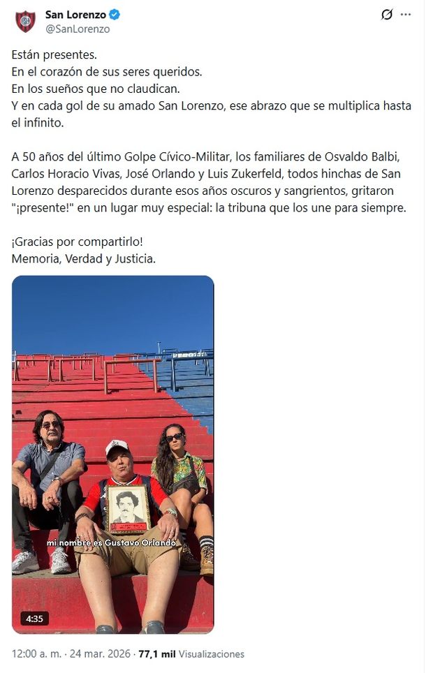 San Lorenzo: Decidió homenajear a sus hinchas desaparecidos (mencionando específicamente a Osvaldo Balbi, Carlos Horacio Vivas, José Orlando y Luis Zukerfeld) a través de un video donde sus propios familiares alzan la voz.