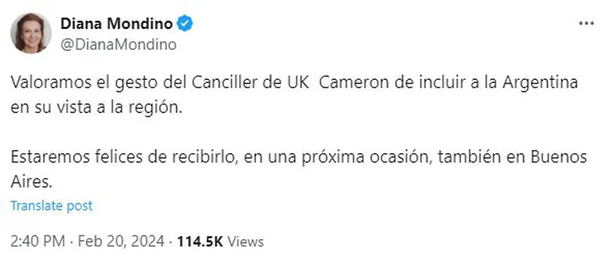 La canciller Diana Mondino valoró el "gesto" del ministro de Relaciones Exteriores británico, David Cameron, por "incluir a la Argentina en su visita en la región", en una tácita reivindicación de la soberanía argentina sobre las Islas Malvinas y manifestó su deseo de "recibirlo" en Buenos Aires en una "próxima ocasión".