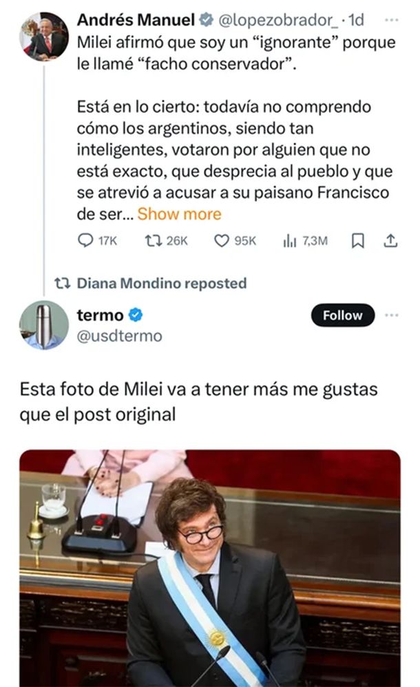 Pero el usuario "Termo" publicó una foto de Milei junto al texto que reza: "esta foto de Milei va a tener más me gustas que el post original", en referencia a un tweet de López Obrador criticando al presidente argentino, que Mondino no dudó en avalar.