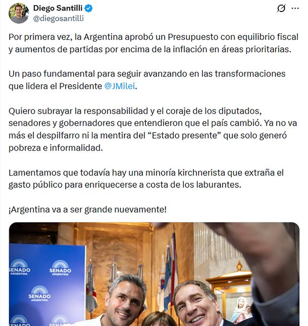 “Por primera vez, la Argentina aprobó un Presupuesto con equilibrio fiscal y aumentos de partidas por encima de la inflación en áreas prioritarias. Un paso fundamental para seguir avanzando en las transformaciones que lidera el Presidente Javier Milei”, escribió Diego Santilli en redes sociales.