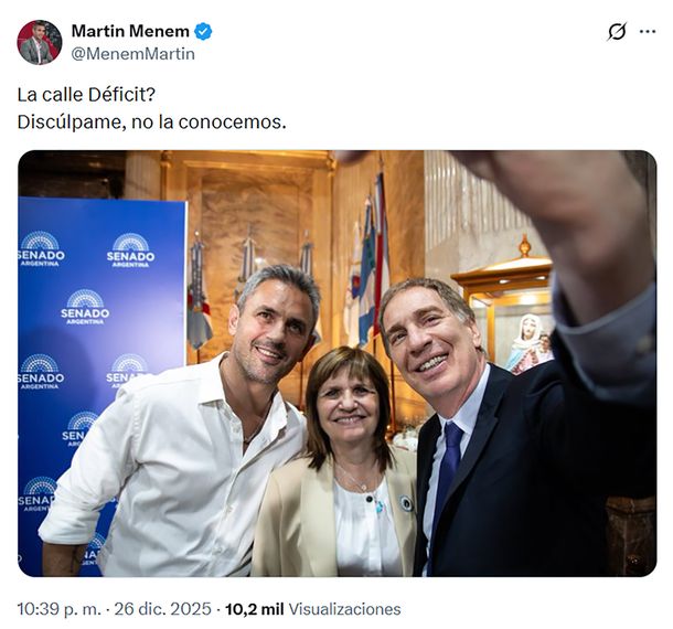 En el mismo sentido y con la misma imagen fue Martín Menem, titular de la cámara baja, quien también celebró la aprobación del Presupuesto 2026, incluyendo un breve texto que hace referencia al “déficit”.