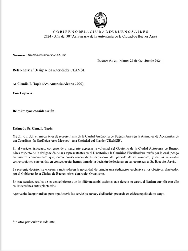 El encargado de comunicarle formalmente a Tapia su desplazamiento fue Gabino Tapia, ministro de Justicia porteño, en una reunión en la que también participó Ezequiel Sabor, asesor principal del Gobierno de la Ciudad y secretario general del PRO porteño. Sabor, quien además es síndico en el organismo, se encuentra al frente de varios aspectos administrativos dentro de la entidad.