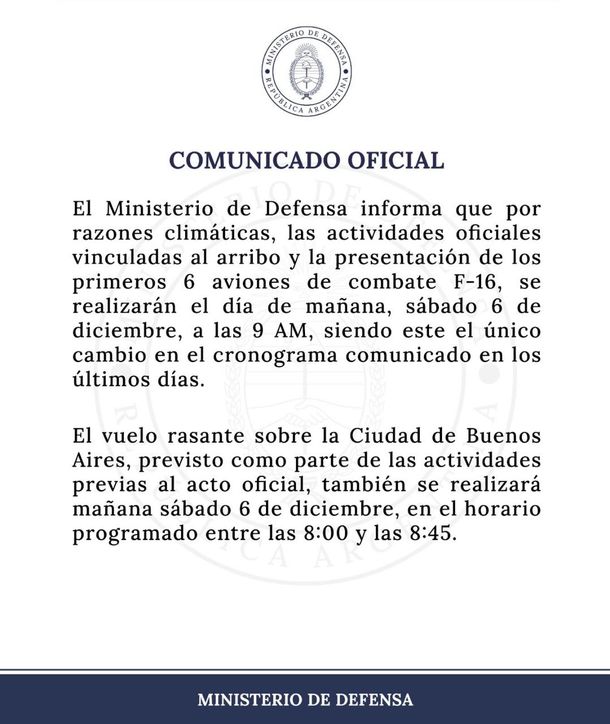 “El Ministerio de Defensa informa que por Defensa razones climáticas, las actividades oficiales vinculadas al arribo y la presentación de los primeros 6 aviones de combate F-16, se realizarán el día de mañana, sábado 6 de diciembre, a las 9 AM, siendo este el único cambio en el cronograma comunicado en los últimos días”, indicaron en primer lugar.