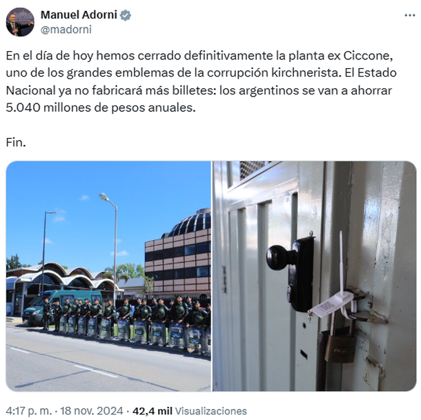 Durante la tarde de este lunes, Manuel Adorni confirmó el cierre de la ex Ciccone Calcográfica: "En el día de hoy hemos cerrado definitivamente la planta ex Ciccone, uno de los grandes emblemas de la corrupción kirchnerista", escribió en X.
