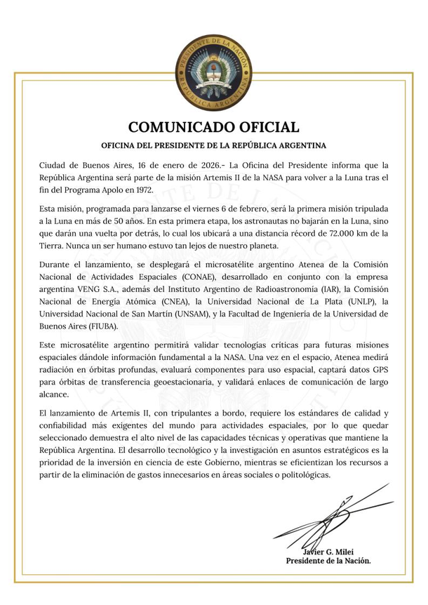 Se trata de "Artemis II", según informó la Oficina del Presidente. Este anuncio se da como parte del alineamiento de la administración libertaria con Estados Unidos.