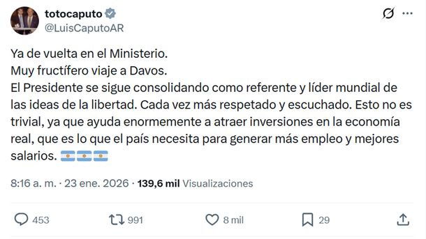 Para el titular del Palacio del Hacienda, “el Presidente se sigue consolidando como referente y líder mundial de las ideas de la libertad. Cada vez más respetado y escuchado”, lo que -según su perspectiva- es “ayuda enormemente a atraer inversiones” que, por ahora, no aparecen.