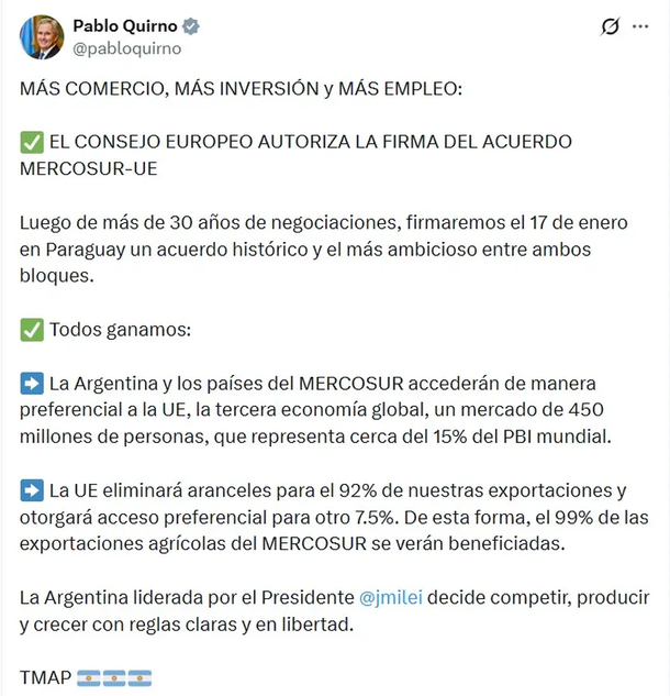 El Gobierno Nacional celebró la aprobación del acuerdo de libre comercio entre el Mercosur y la Unión Europea (UE) por parte del Consejo europeo en Bruselas, que finalmente se llegará a cabo el próximo 17 de enero tras tres décadas de negociaciones.
