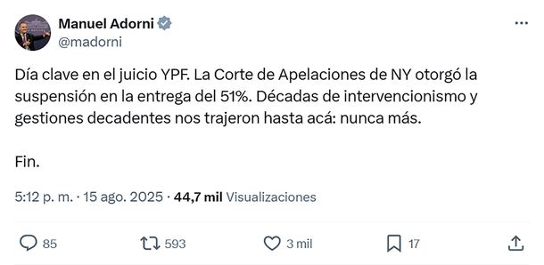 "Día clave en el juicio YPF. La Corte de Apelaciones de NY otorgó la suspensión en la entrega del 51%. Décadas de intervencionismo y gestiones decadentes nos trajeron hasta acá: nunca más. Fin", manifestó en sus redes el vocero presidencial.