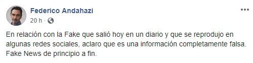 "En relación con la Fake que salió hoy en un diario y que se reprodujo en algunas redes sociales, aclaro que es una información completamente falsa. Fake News de principio a fin", publicó el escritor y militante macrista en su cuenta de Twitter luego de que todas sus miradas se posaran en él.