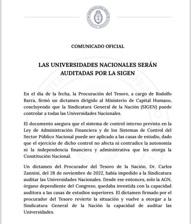 "En el día de la fecha, la Procuración del Tesoro, a cargo de Rodolfo Barra, firmó un dictamen dirigido al Ministerio de Capital Humano, concluyendo que la Sindicatura General de la Nación (SIGEN) puede controlar a todas las Universidades Nacionales", señala el comunicado difundido por el Ministerio de Capital Humano.
