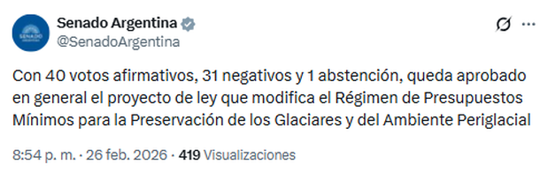 El Senado de la Nación le dio media sanción a la reforma de la Ley de Glaciares (Ley 26.639) este jueves, en medio de una votación ajustada que terminó con 40 votos a favor y 31 en contra. Esta reforma es clave para la agenda del oficialismo y de las provincias mineras, pero ha generado un rechazo muy fuerte en sectores ambientalistas.