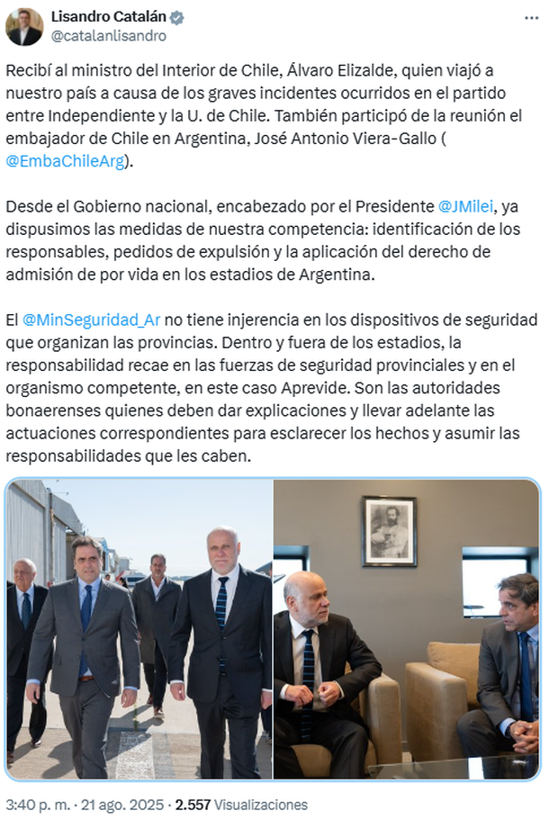 Tras la reunión, Catalán informó en su cuenta de X: "Recibí al ministro del Interior de Chile, Álvaro Elizalde, quien viajó a nuestro país a causa de los graves incidentes ocurridos en el partido entre Independiente y la U. de Chile. También participó de la reunión el embajador de Chile en Argentina, José Antonio Viera-Gallo (@EmbaChileArg)".
